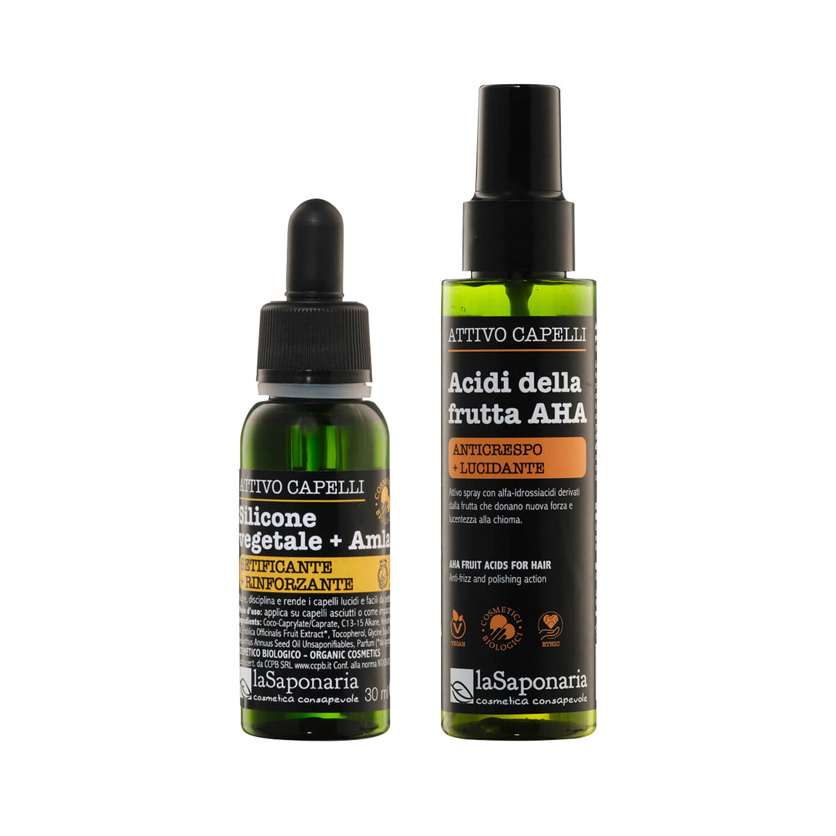 Stačí pár kapek a tohle vlasové duo vám vykouzlí z neposlušného hára hedvábné a lesklé pramínky. Zkrotit rozlítané vlasy, dodat jim lesk nebo usnadnit jejich styling umí spolehlivě Rostlinný silikon (suchý olej) s amlou a Aktivní sprej s AHA ovocnými kyselinami. Oba poklady vznikly ve vědomé laboratoři italské značky laSaponaria z pečlivě vybraných přírodních surovin. 100% přírodní rostlinný silikon vlasy zjemňuje, zanechává je lesklé a snadno rozčesatelné. Amla působí jako přírodní kondicionér. Obsah vitamínů, flavonoidů a antioxidantů zase podporují zdravý růst vlasů. Ovocné AHA kyseliny vlasy vyživují a chrání, zabraňují krepatění a jako bonus prodlužují intenzitu barvy a melírů. A to nejlepší nakonec – speciální složení chrání vlasy před zanášením vodním kamenem a solí, které vlasové vlákno dehydratují. Ihned po nanesení spreje se vlasy snadno upravují. Přírodní vědomá kosmetika je vyrobená s láskou, v BIO kvalitě jak jen to je možné a s posláním „zanechat svět o něco lepším místem“. To je laSaponaria, která vás chytne za srdce. Nádherně voní, je vyrobena z těch nejkvalitnějších lokálních surovin a zároveň pomáhá, kde se dá. Podporuje místní malé farmáře, sociální projekty ale i fair trade. Vše je výsledkem poctivé, řemeslné ruční výroby a věřte, že to pocítíte. Samozřejmostí je žádné testování na zvířatech a žádné živočišné suroviny. Nezapomíná se ani na obaly, které jsou z velké části recyklované. Zkuste jednou a budete chtít znovu…