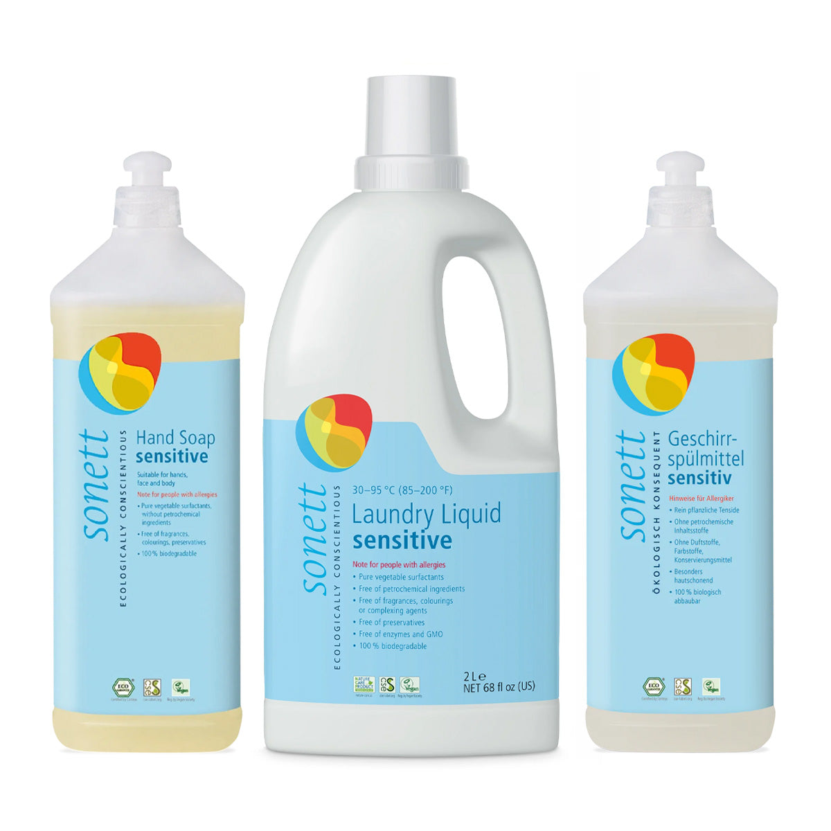 Tohle úklidové trio pracího gelu, tekutého mýdla a prostředku na nádobí za zvýhodněnou cenu potěší nejen peněženku, ale také extra citlivou a alergickou pokožku. Německý Sonett totiž speciálně pro citlivky vyvinul řadu Sensitive, která je 100% přírodní, bez vůní a jiných dráždivých látek. Prostředek na nádobí je vysoce koncentrovaný, takže ho stačí kapka, univerzální tekutý prací gel si poradí s barevným i bílým prádlem, bavlnou, lnem i textilními směsi. A tekuté mýdlo můžete napěnit na rukách, obličeji i celém těle. Všechny tři produkty jsou navíc 100% odbouratelné v přírodě, vhodné pro použití se septiky a domácími čističkami a certifikované EcoGarantie.[[8veciprani]] Sonett jsme si zamilovali. Vyrábí nejspíš tu nejkvalitnější a nejčistší ekologickou drogerii, kterou lze v Česku sehnat. Do důsledků řeší kvalitu surovin, výrobu svých prostředků a dopad na naše zdraví i životní prostředí. Garantují 100% odbouratelnost všech svých produktů. Používají dokonce suroviny v BIO kvalitě, což je i ve světě ekodrogerie velmi neobvyklé. Zcela výjimečný je fakt, že používají i energeticky silné balzamické přísady, které dále rytmizují a taktéž pravotočivě vířenou, energizovanou vodu. Samozřejmě žádné živočišné suroviny, žádné testování na zvířatech.